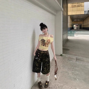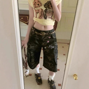 アメリカンレトロ迷彩オーバーオールレディース夏新作マルチポケットストレートカジュアルワイドレッグパンツルーズクロップドパンツ