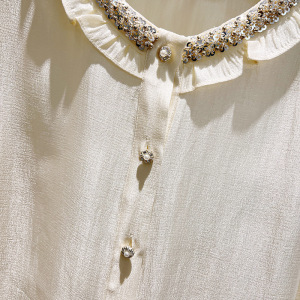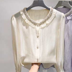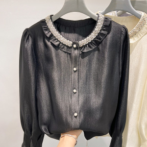 2025 新韓国スタイルラウンドネックスパンコールビーズシングルブレスト長袖シフォンシャツ女性のための春