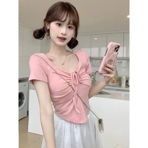2025 アイスシルクスレッド右肩 Tシャツレディース夏甘辛デザイン巾着 V ネック不規則なショートトップ