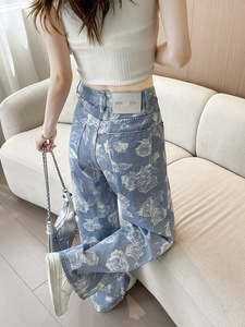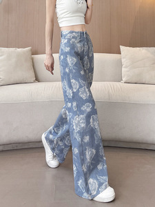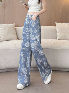 ワイドレッグパンツ 2025 プリントハイウエストジーンズ女性の夏ルーズローズパターンスリムストレートフロアレングスパンツ