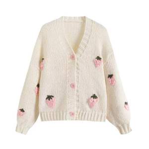 春と秋の気質多用途Vネックニットカーディガン、ファッショナブルで優しく甘い女の子の立体的なイチゴショートセータージャケット