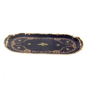 ヨーロピアンスタイルの金彩コバルトブルー手描き浮彫り楕円形デザートプレート 白磁コバルトブルー浮彫り