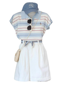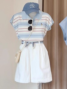 コントラストストライプポロラペル小さなフライングスリーブ半袖Tシャツ女性用2025新しいスタイルユニークで美しい初夏のトップス