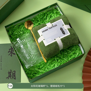 14.ひまわりカップ(スプーン)+コーラルベルベットタオル+グリーンギフトバッグギフトボックス
