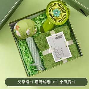 1.よもぎハンマー + 小さなファン + コーラルベルベットタオル + グリーンギフトバッグギフトボックス