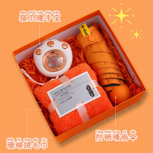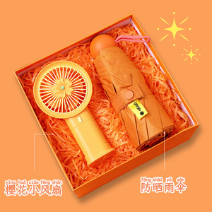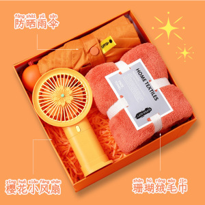 5. 傘 + 小型扇風機 + タオル + オレンジ色のギフトバッグ ギフトボックス