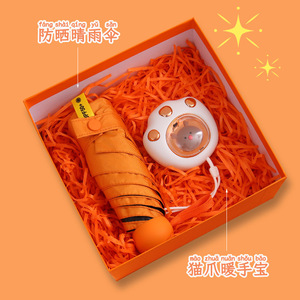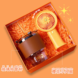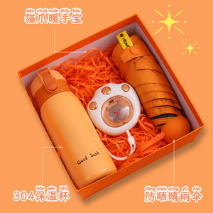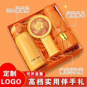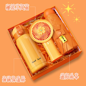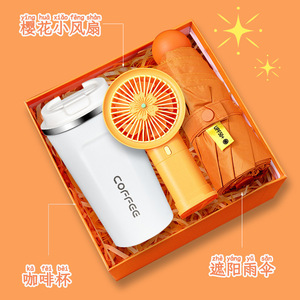 6. 魔法瓶カップ + 傘 + 小型扇風機 + オレンジ色のギフトバッグギフトボックス