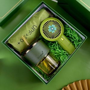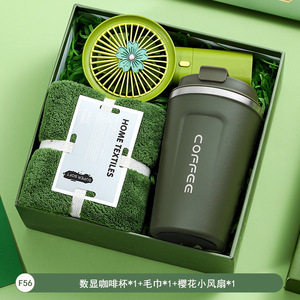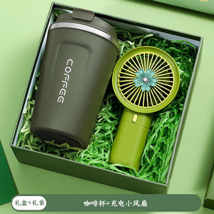 6. コーヒーカップ + タオル + 小さな扇風機 + グリーンギフトバッグギフトボックス