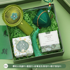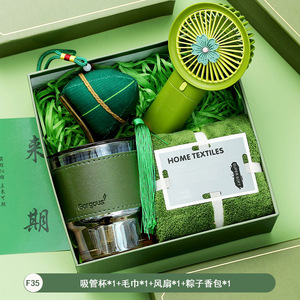 21. 竹カップ + タオル + 小さな扇風機 + Zongzi サシェ + グリーンギフトバッグギフトボックス