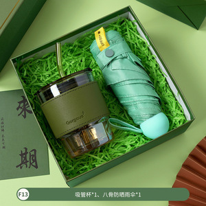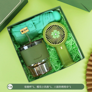 25. 竹カップ + 小さな扇風機 + 傘 + 緑のギフトバッグ ギフトボックス