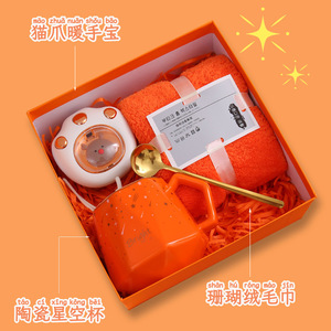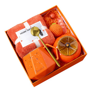16. セラミックカップ + 小さな金のスプーン + 柿瓶 + タオル + キーホルダー + オレンジのギフトバッグギフトボックス