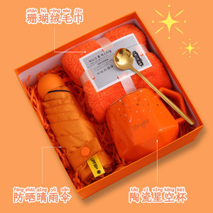 14. セラミックカップ + 小さな金のスプーン + 傘 + タオル + オレンジ色のギフトボックス