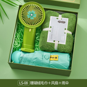 18. 傘 + 小型扇風機 + コーラルベルベットタオル + グリーンギフトバッグギフトボックス
