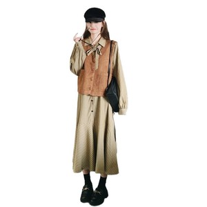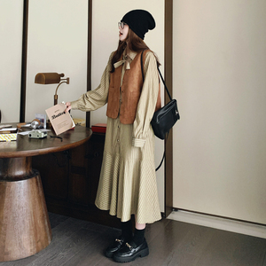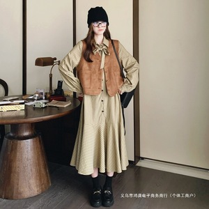 跨境一整套法式小众条纹衬衫连衣裙套装女2025春季新款复古马甲两