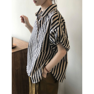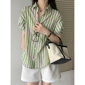ストライプのルーズシャツレディース夏の新しいスタイルのバブル半袖シャツ年齢を減らす美しい西洋スタイルのハイエンドトップ