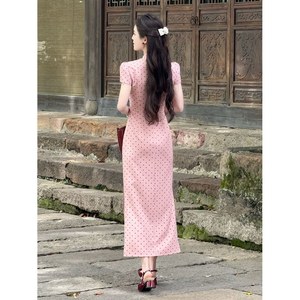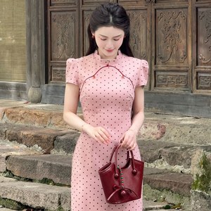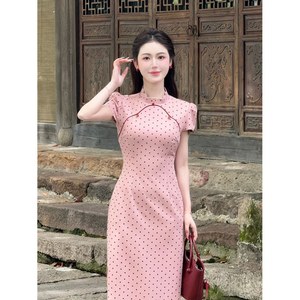 【絵江南に入る】2025夏新作新中国式暖かいピンクの波点改良チャイナドレス日常ワンピース