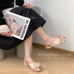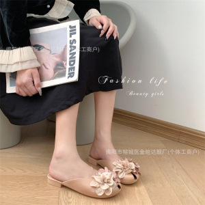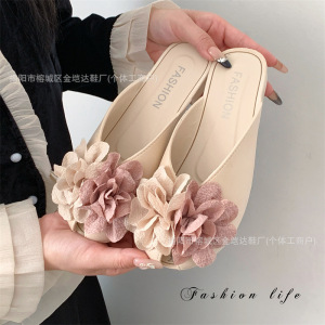 2025 新しい夏のファッション包頭フラットハーフスリッポン女性のアウターウェア花中空妖精スタイルスカートサンダルとスリッパ