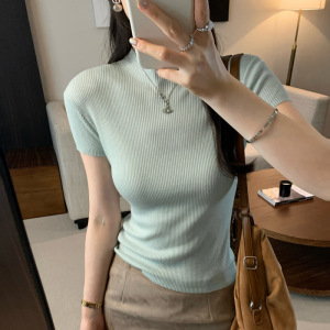 ホット販売リヨセルテンセル薄いハーフタートルネックショルダー半袖セーター女性のための 2025 夏の新しい Tシャツトップ