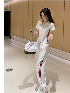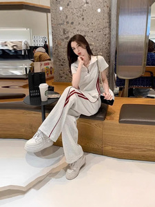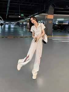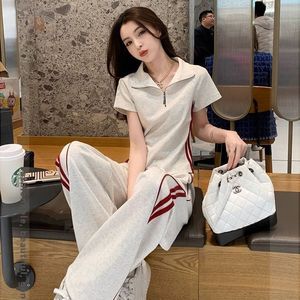 女性用カジュアルスポーツウェアスーツ、夏の新しいスタイル、半袖ポロカラートップ、年齢を軽減するファッショナブルなワイドレッグパンツ2点セット