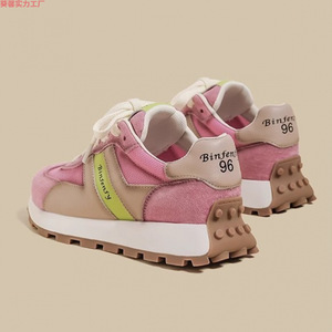 2025真皮厚底阿甘鞋女新款炸街复古做旧粉红色运动老爹德训鞋潮