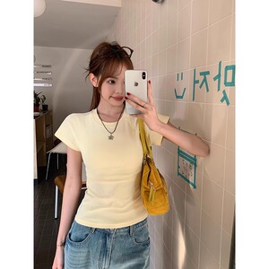 ホワイトグースイエローショルダー半袖Tシャツレディース2025年夏新デザイン香港風スリムフィットショートトップ