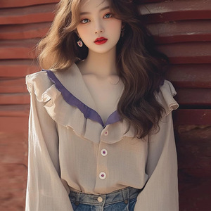 フリル長袖レディース新作シャツ、フェミニンボトムシャツ、おしゃれな小さめシャツ、年齢軽減トップス、女性用ドールカラーシャツ