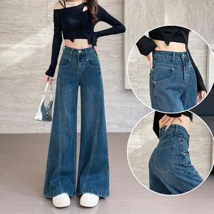 レトロブルーワイドレッグジーンズ女性の夏の新しい大きいサイズファットmmデザインスプライシングスリムストレートレッグフロアレングスパンツ