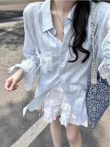 レースステッチ日焼け止めシャツ女性の夏の薄い新しい甘いデザインルーズカーディガンシャツリボン付き
