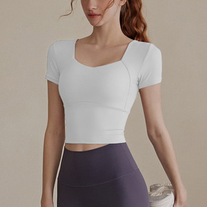 胸パッド付きヨガ服トップス女性の夏半袖 Tシャツピラティス高級感タイトなランニングスポーツフィットネス