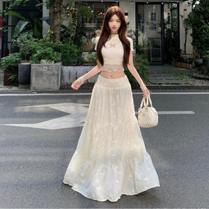 レースステッチ蝶中空半袖Tシャツレディースサマーデザインスーツ優しいハイウエストスカート2点セット