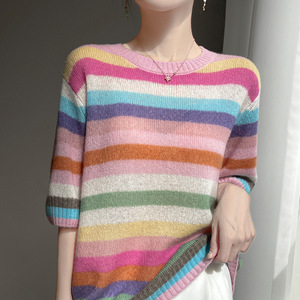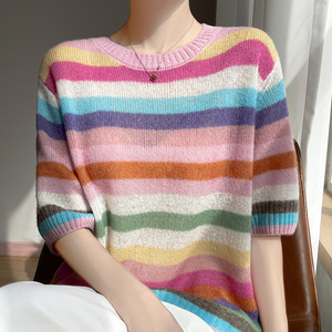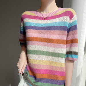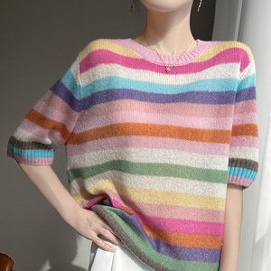 エレガント〜75カシミア25マルベリーシルク半袖レディースラウンドネックレインボーストライプルーズ薄手Tシャツ半袖セーター