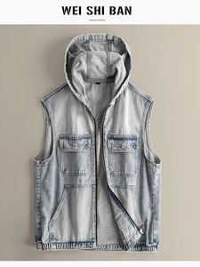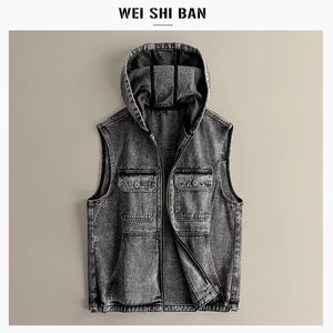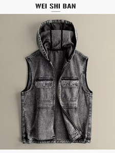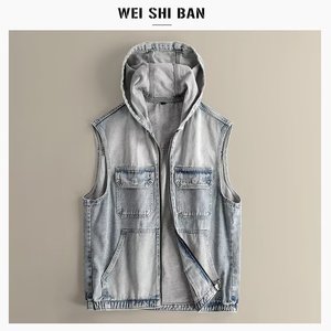 アメリカンレトロハイストリートフード付きチョッキデニムベストメンズ春夏トレンディブランドヘビーウェイトフード付きオートバイジャケットジッパーベスト