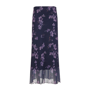 外贸复古紫色植物印花网纱拼接显瘦半身裙优雅女人风vintage长裙