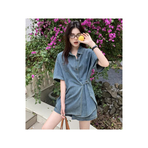 気品がだるくて、新しい夏のデザイン感のあるデニムシャツを着ています。