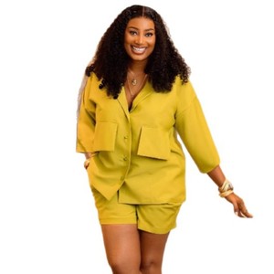 ヨーロッパとアメリカの女性の大きいサイズのルーズカジュアル無地大きなポケットラペルシャツショーツアフリカのファッション新しいツーピースセット