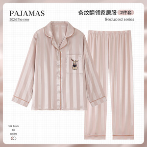 かわいいウサギのストライプのカップルパジャマ女性のための春と秋のアイスシルク長袖ズボン模擬シルク春と夏の男性のホーム服