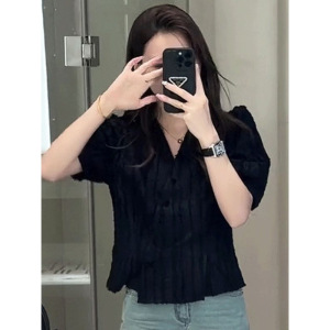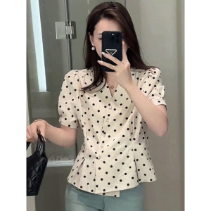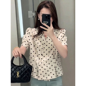 気質 V ネック水玉半袖シャツ女性の夏 2025 新しいパフスリーブ美しい小さなシャツシフォントップ