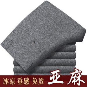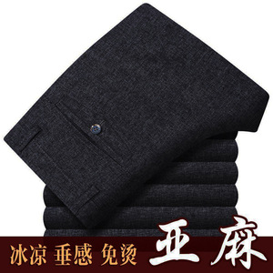 夏用薄手メンズアイスシルクリネン中高年カジュアルパンツノンアイロンパンツゆったり綿麻ストレートメンズパンツ
