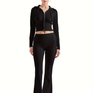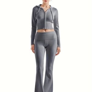 レディース ジップ ニット フード付き クロップド ジャケット スリム フィット フレア