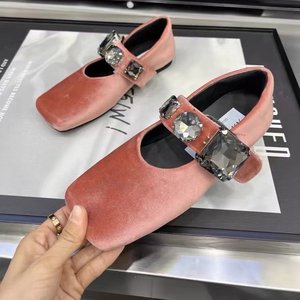 ヨーロッパステーション 2025 新しい夏スタイルのソフトソール快適なゴールドベルベットファッショナブルな明るいダイヤモンドスクエアトゥワンストラップメリージェーンシューズ女性用