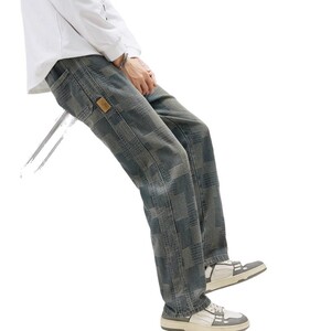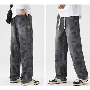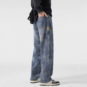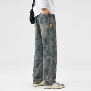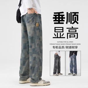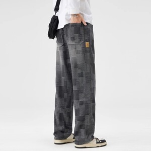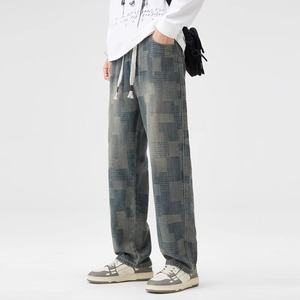アメリカンレトロ星空柄チェッカーボードジャカードジーンズメンズ春秋新作トレンドハイストリートバイブストレートパンツ