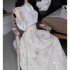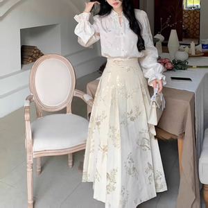 YQGFS (YQGFS) # 2025 新中国風エレガントヘビーデューティジャカード馬面スカート長袖シャツ 2 点セット