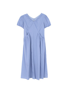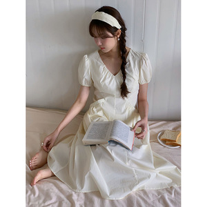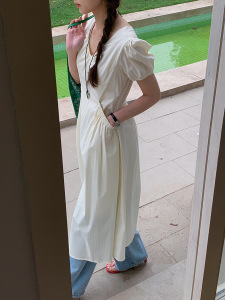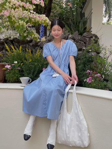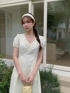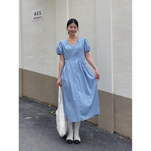 【韓系アフタヌーンティー】歌銘レトロvネックポケットワンピース女装泡袖修身a字スカートY4843F