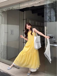 フレンチノースリーブベストイエロードレスレディース2025年夏新作初夏着用海辺リゾートスタイルロングスカート