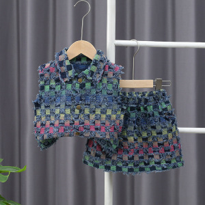 夏の新しい韓国スタイルの女の子デニム迷彩小さなチェック柄ノースリーブドレスベビーかわいい子供ドレス 2 点セット