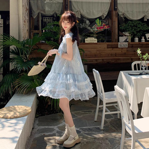 夏の新鮮なブルーチュール花柄ドレス 2025 新しい女性のフライングスリーブ小柄な A ラインスカートショートスカート
