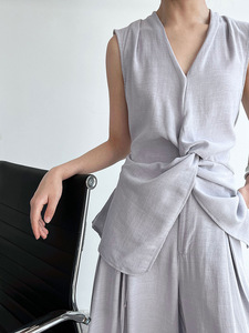 鹿西デザイン感vネックノースリーブベストワイドパンツ女性夏新作スリムリネンセット2683