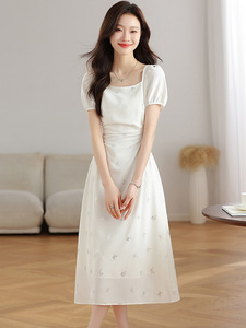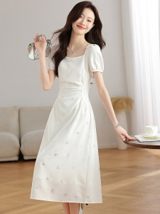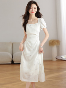 バタフライスクエアネックドレス、フレンチスタイル、フレッシュ気質、初恋ロングドレス、ウエストを絞ってスリムに見せる、白桑シルクフェアリードレス