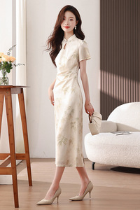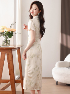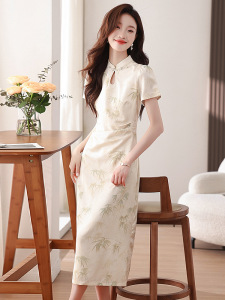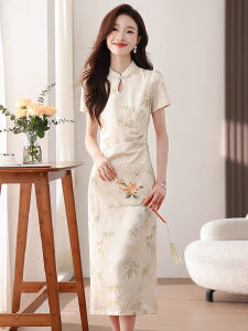 改良型立襟旗袍ドレス2025夏中国風竹葉柄桑蚕シルクロングドレスプリーツウエストタイトワンピース