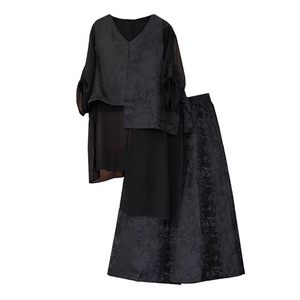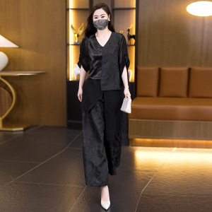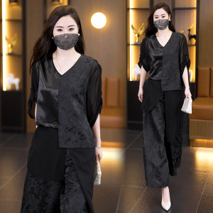 品質保証、快適なシルク気質、中年女性の夏の大きいサイズの新しい中国風トップス、ゆったりとしたワイドレッグパンツのツーピーススーツ